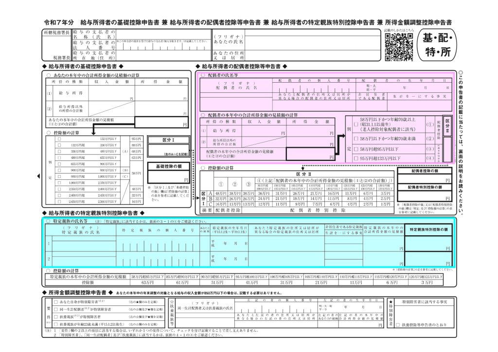 ⇩基礎控除申告書兼配偶者控除等申告書兼特定親族特別控除申告書兼所得金額調整控除申告書(以後省略して「基配特所」とします)をご覧ください。
