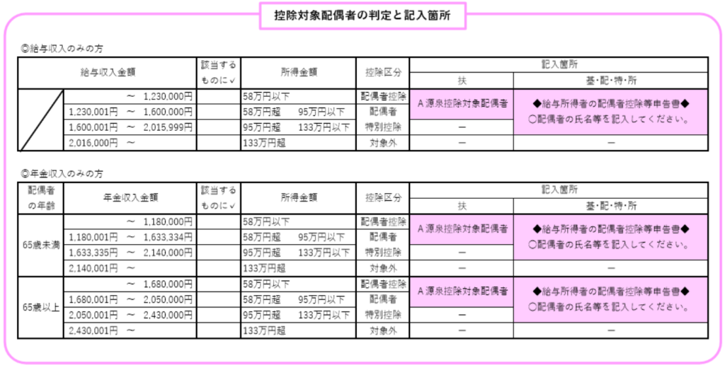 配偶者の所得金額(年金収入の場合は年齢にも注意)に応じて、控除区分が分かれており、記載箇所も異なります。