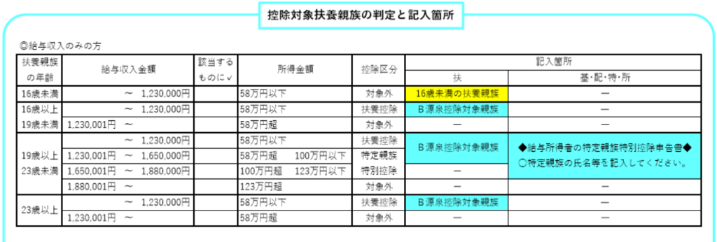 ⇩扶養控除や、特定親族特別控除に該当する場合は、こちらの表を参考にしてください。